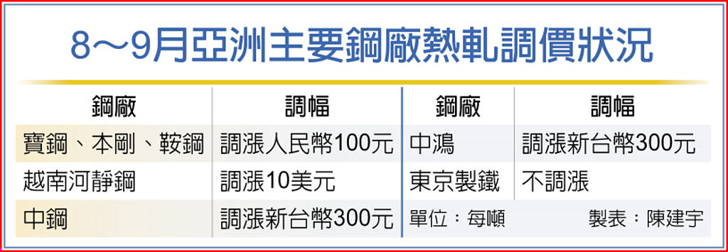 此外,近期煤鐵原料價格上漲,且亞洲指標鋼廠均開漲盤,鋼市落底預期引動下游補庫,待高溫多雨季節性因素消除,鋼鐵需求進一步釋出後,鋼市將加速回復熱絡,也是中鴻決定提價的原因。