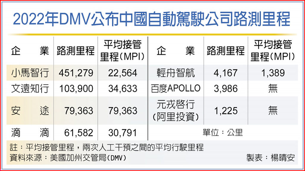 美國加州交管局(DMV)3月公布2022年自動駕駛路測的「年度脫離報告」,是目前自動駕駛領域較受認可的衡量標準之一。其中,參與路測的中企共有七家,包括小馬智行、文遠知行、安途、滴滴、輕舟智航、百度APOLLO和獲阿里巴巴投資的元戎啟行。