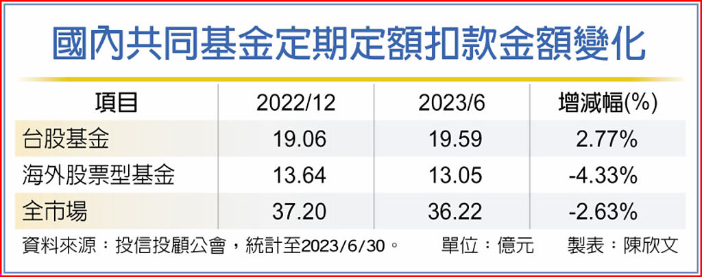今年來投信共同基金定期定額扣款金額下降2.63%至36.22億元,但其中台股基金定期定額扣款金額不減反增,同期增加2.78%至19.59億元,海外股票型基金則減少4.33%至13.05億元。法人表示,此代表定期定額基金扣款的金額中,超過一半是扣款投資台股基金,呼應交易所統計的定期定額存個股與ETF基金規模,逐月攀升的趨勢,顯示台股在存股族心中的主場優勢。