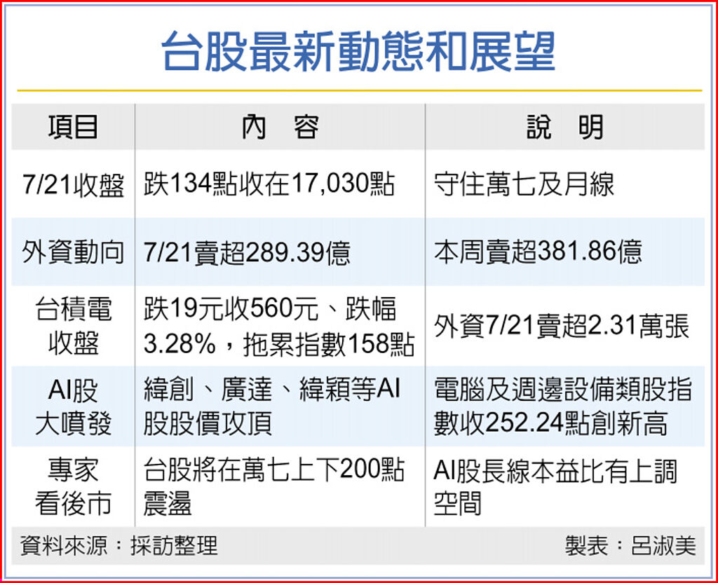 台股受台積電法說會利空衝擊,21日下跌134點,跌幅0.78%,在亞洲主要股市中最為弱勢。所幸台積電釋出AI產業正向訊息,激勵AI族群大復活,帶動大盤逐步收復失土,終場留下逾170點下影線以17,030點作收,若扣除台積電大跌拖累指數的158點,台股整體仍是上漲。投資專家指出,看好AI股長線後市,台股守住萬七後有機會蓄勢再攻。