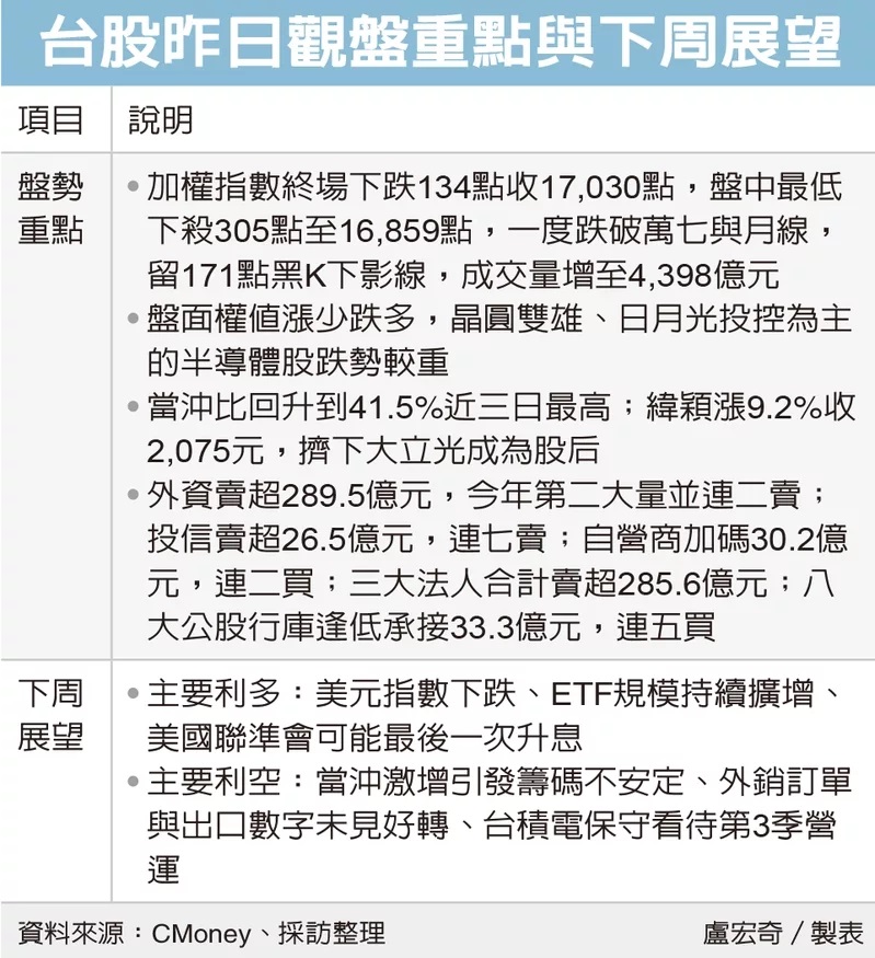 值得注意的是,7月初至昨日止,外資累計賣超786.5億元,投信因應投資人贖回賣壓,亦調節131.8億元,分別改寫近九月、近24月來最多紀錄,同期間融資餘額大增超過100億元,後續籌碼穩定度恐面臨不小的考驗。