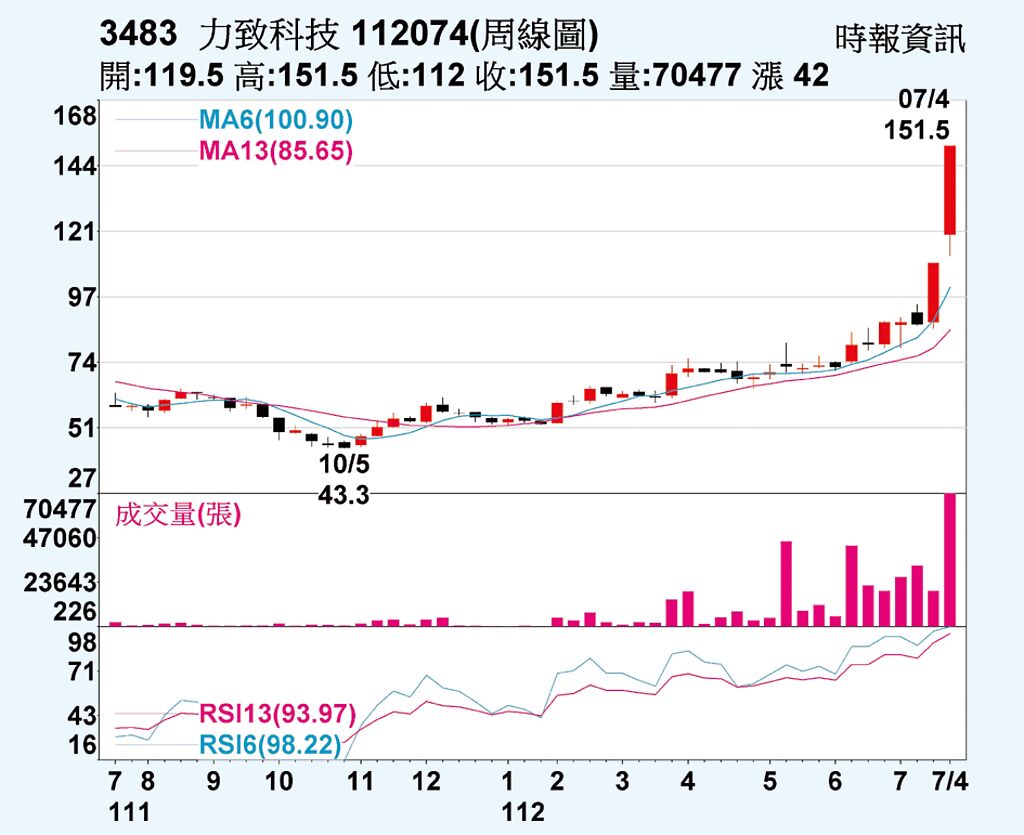 力致(3483)因股價漲多,20日應主管機關要求公布最近期獲利,沒想到自結獲利超乎市場預期,6月單月EPS 1.12元,一舉賺贏首季的EPS 0.4元,基本面激發多頭士氣,21日不單跳空開高,直接站上150元,在稍事震盪後,更直接鎖上漲停,在漲聲不停下,力致周漲幅一舉飆升至38.4%。