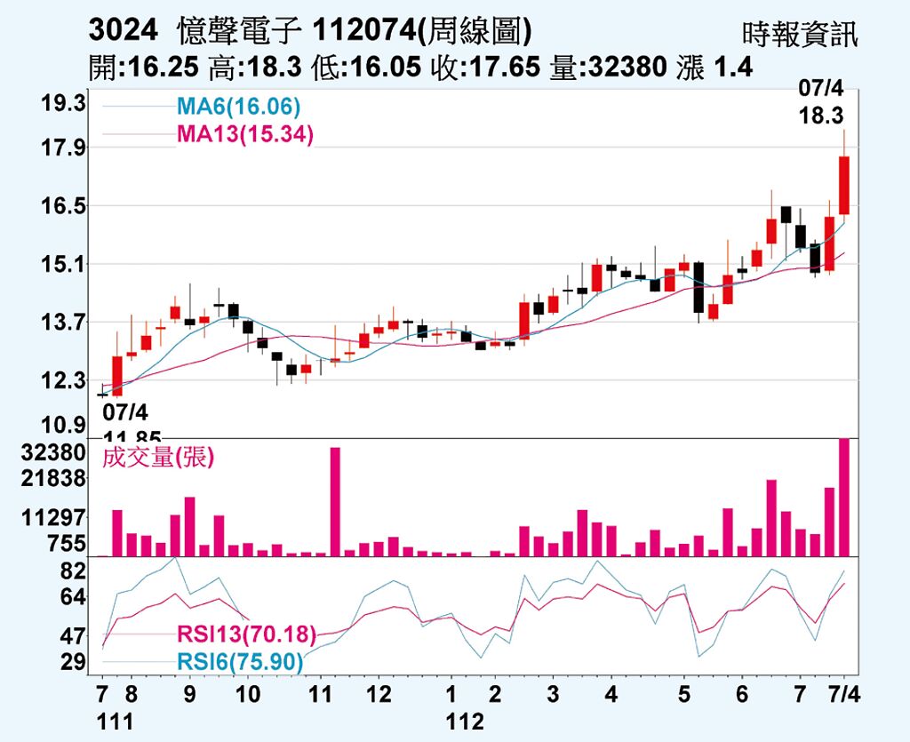 憶聲(3024)受惠於股價低位階,吸引特定買盤介入,21日無懼於大盤指數重挫134點,股價震盪走高一度逼近漲停,終場漲幅雖然收斂至5.37%,以17.65元作收,收盤價仍站上本波段高點,累計7月以來,憶聲的累計漲幅達14.24%。
