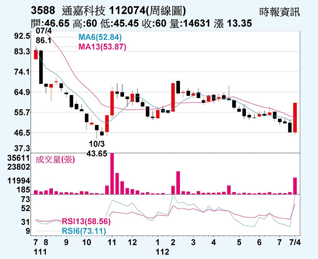 隨著蘋果iPhone 15 Pro新機即將發布,通嘉TYPE-C PD產品使用率將提高,有望帶動營收谷底回升。通嘉21日股價自盤下一路走高,終場收60元,漲7.53%。歷經一年以上之整理,量價齊揚、一舉突破半年線及年線反壓,成交量也溫和放大,連三日增加,谷底翻揚型態值得留意。 |