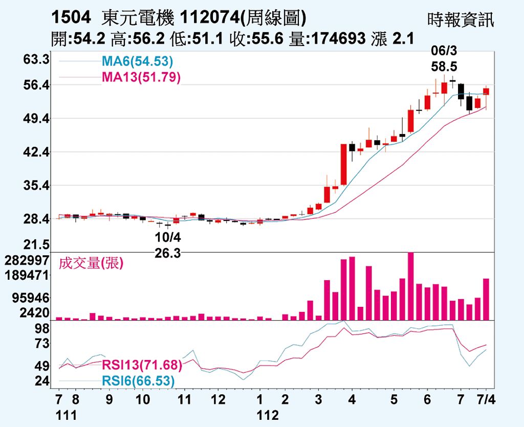 東元(1504)搶攻能源大餅,獲台電大單,激勵21日股價出量走強,跳空開高並收55.6元,上漲2.7元,成交逾6萬張,為近一個月大量,東元自年初自27元起漲,近月橫盤整理、回測季線,日K連二紅突破糾結均線,並帶動5日線翻揚,KD指標黃金交叉、MACD值由負轉正,短線翻多,籌碼上外資持續加碼,近10日合計買超近2萬張。