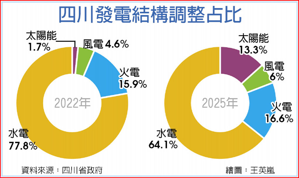 四川是大陸少數進行綠電最徹底的省份之一,約80%的電力來自水電,但也因此受制氣候變遷。官方正計畫到2025年時大幅提升太陽能建設,降低對水電的依賴。而為了避免今夏供電出狀況,四川官方今年稍早與寧夏、甘肅和陝西簽署電力採購合約,6月份甚至遠從2千多公里外的黑龍江省購電,傳輸網路也進行升級。中國鐵塔、國家電網也大力推動儲能設施建設。
