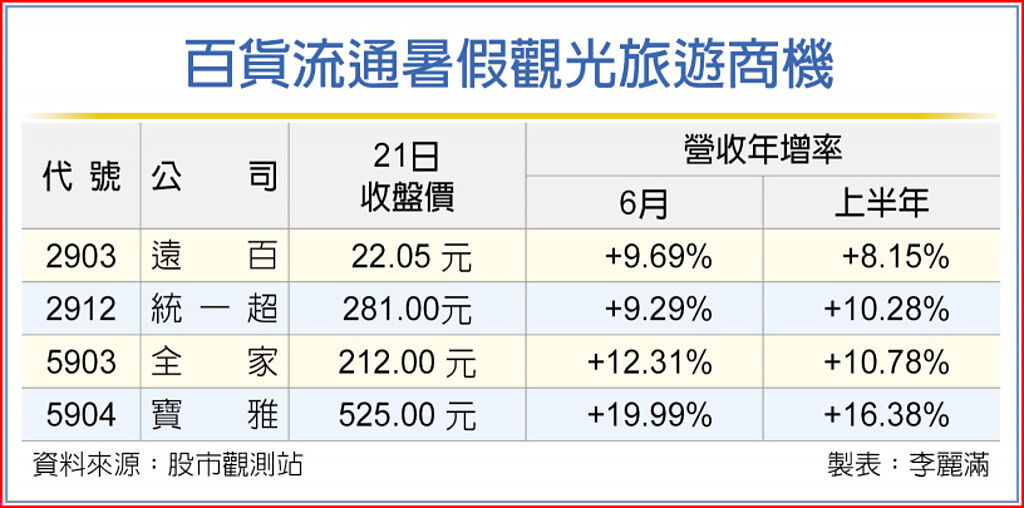 暑假出遊潮加上高溫加持,讓百貨公司和超商等零售賣場人潮湧入,營收延續上半年穩定成長的力道。7月以來,除國人日常「避暑」人流增加之外,因國外旅客來台數大增,也帶動美妝通路業績走揚。包括遠百、統一超商、全家、寶雅等具暑假觀光旅遊題材的賣場業者,7、8兩月連續都有好業績挹注,第三季表現將明顯超越去年同期。