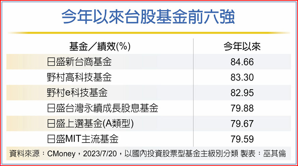今年以來至7月20日台股漲幅已達21.4%,櫃買指數也有24.5%成績,觀察135檔主動式台股基金表現,統計至20日有六檔交出超過7成報酬率,前三名更直衝8成,超越大盤達4倍,包括日盛新台商基金、野村高科技基金、野村e科技基金。