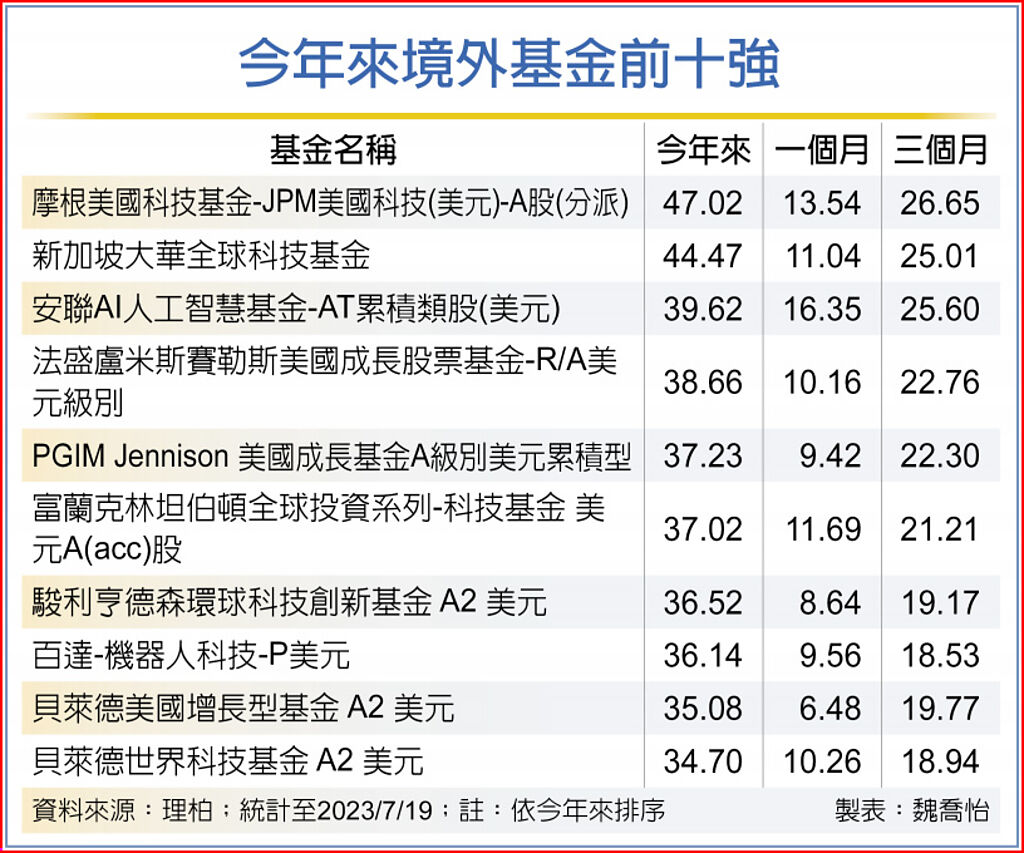 AI、科技領軍,境外基金十強今年來繳出績效逾34%好表現,甚至有二檔飆破40%。根據理柏統計至7月19日,JPM美國科技基金、新加坡大華全球科技基金今年以來飆破40%,安聯AI人工智慧基金也漲近4成,前十名有七檔主要聚焦在AI、科技股等主題,其餘是成長主題。