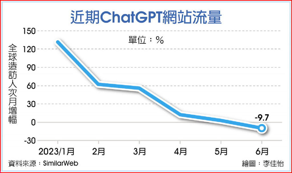 不僅ChatGPT應用程式下載量減少,ChatGPT網站流量成長也減速,SimilarWeb調查顯示,今年1月ChatGPT網站全球造訪人次月增幅高達131.6%,但5月的月增幅只剩2.8%,6月造訪人次甚至月減9.7%,首度陷入衰退。