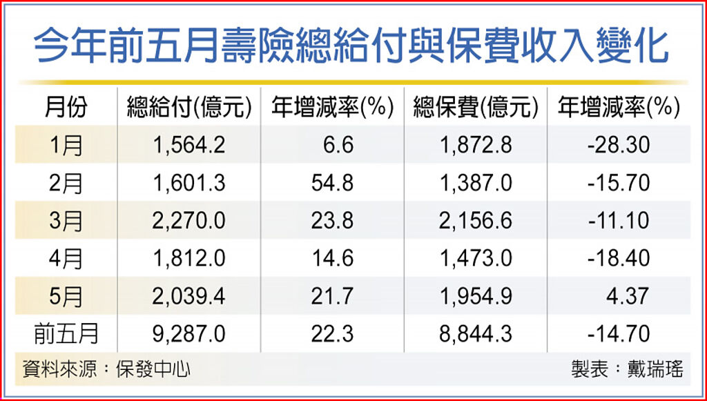 4月美元持續走強,新台幣貶值下,解約金續在千億元之上,總給付仍大於總保費;5月新台幣續貶,加上市場對聯準會7月升息機率再升高,解約金超過1,200億元,總給付金額再度超過2,000億元大關,來到2,039.4億元,但總保費收入僅有1,954.9億元,壽險業連四個月呈現淨流出。