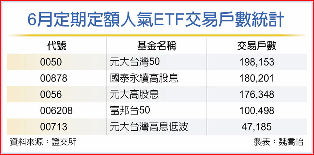 6月定期定額人氣ETF出爐,其中二檔股價飆新高。據證交所統計,6月定期定額人氣前五大包括元大台灣50、國泰永續高股息、元大高股息、富邦台50、元大台灣高息低波,其中國泰永續高股息ETF在7月18日股價飆到21.43元、創掛牌以來新高,元大台灣高息低波也在18日創新高。