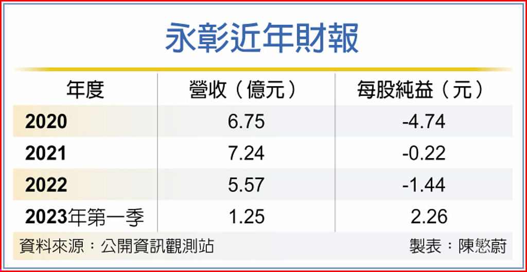 隨著公司積極轉型、本業營運體質持續轉佳,再加上處分大陸子公司股權入帳,法人看好,永彰全年業績有機會轉盈。永彰上半年營收2.75億元、年減3.08%,第一季在業外挹注下,單季稅後純益達1.45億元,每股純益2.26元。 |