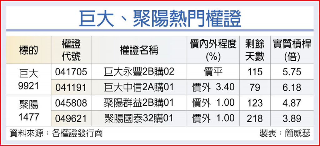 台股24日收在平盤附近,非科技股卻冒出久違亮點,自行車指標股巨大(9921)在大和資本證券升評「優於大盤」激勵下,終場上漲3.87%、收241.5元;摩根士丹利證券則看好紡織族群代表聚陽(1477),推測合理股價高達350元。