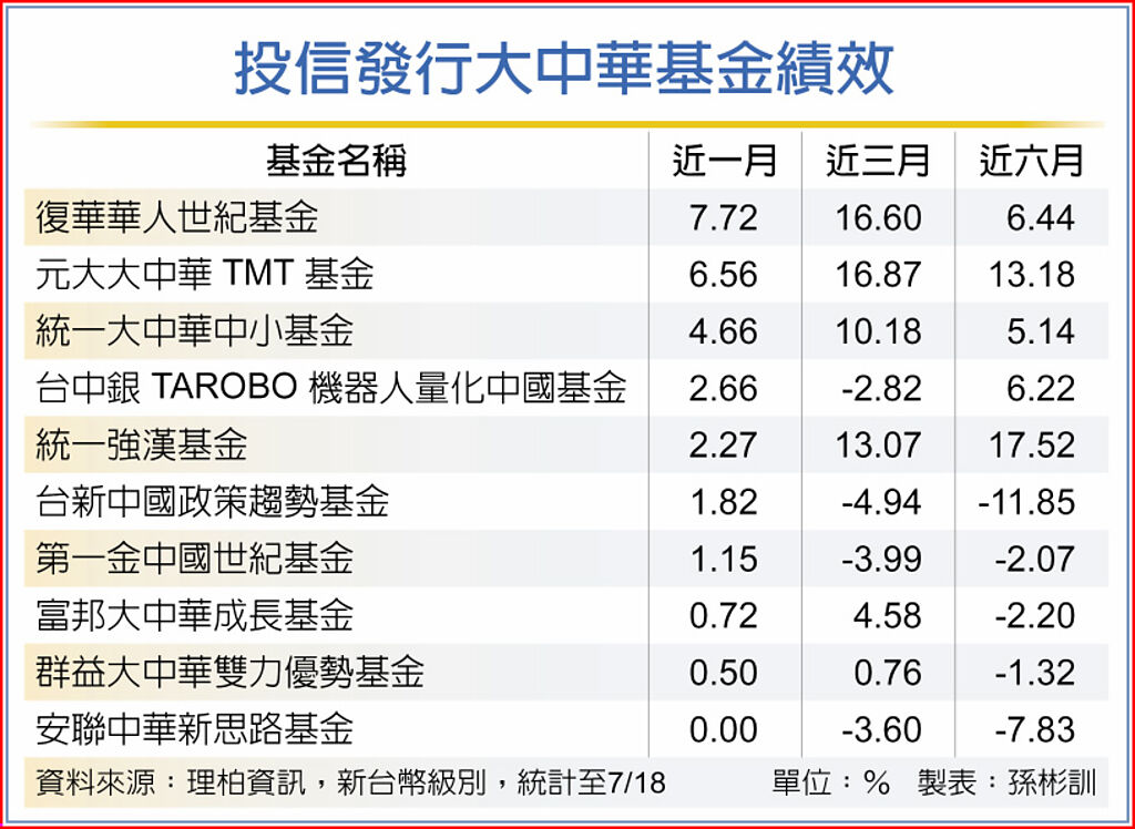 今年來陸港股受經濟數據疲弱拖累,主要指數近一個月或今年來多負報酬,但大中華基金透過經理人選股不選市,績效表現相對亮眼,多檔基金同期間仍繳出正報酬。
