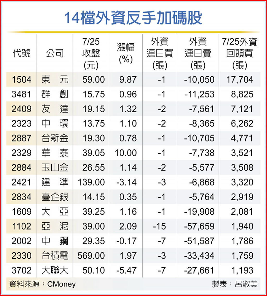 外資終結連三日賣超,25日轉為買超96.04億元,鎖定東元(1504)、面板雙虎、台積電(2330)等14檔個股回頭敲,買超都在1,000張以上;其中,亞泥(1102)更從連15日賣超57,659張,25日轉為買超1,940張。