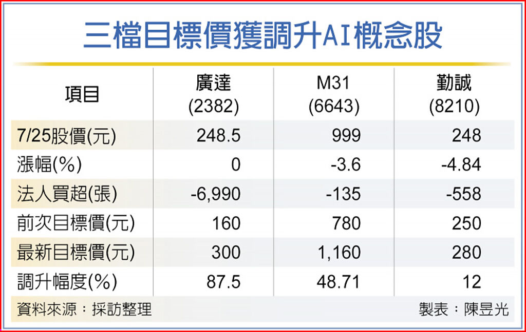 AI題材持續發燒,扮演近期盤面主攻手,在相關需求大幅成長預期下,大型投顧法人也紛紛上修供應鏈未來獲利表現,廣達(2382)、M31(6643)、勤誠(8210)等皆目標價同獲調升。