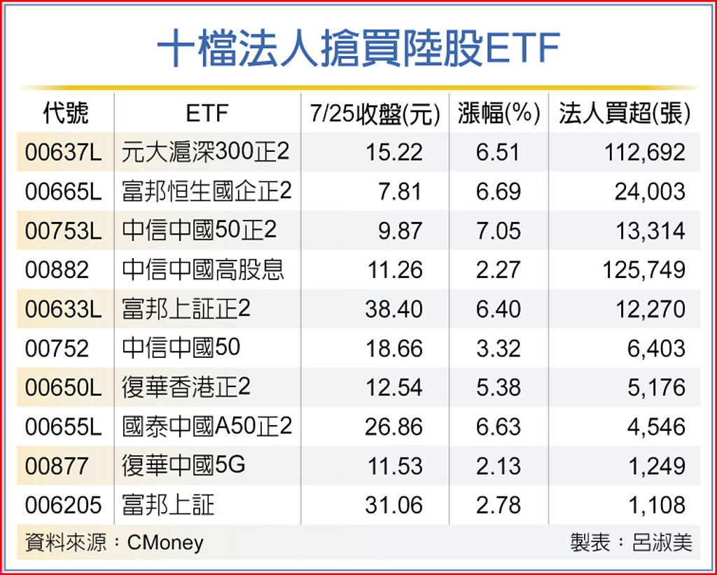 近來陸股因經濟景氣疲軟而不振,市場傳中國大陸第三季可望再降準及人行可能在市場拋匯、拉升人民幣,受政策全力作多激勵,陸港股25日同步強彈2%~4%以上,尤其中信中國50正2(00753L)大漲7%最亮眼;元大滬深300正2(00637L)等十檔陸股ETF法人大敲。