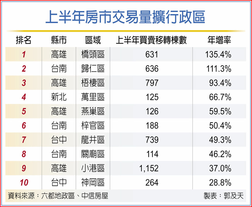 受政策打房影響,導致近期房市買氣降溫、交易量縮,不過仍有不少中南部蛋白區受惠產業投資議題帶動,交易逆勢擴量。據統計,上半年六都各行政區中,高雄橋頭、台南歸仁兩區房市買賣移轉棟數分別年增135%、111.3%,增幅前二名,六都27個房市交易量增行政區中,北北桃三都僅占4個,超過85%都位於中南高三都的蛋白區。