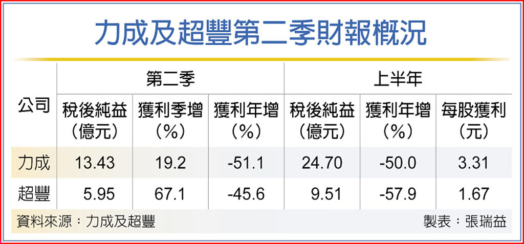 力成第二季稅後純益13.43億元,季增19.2%,第二季EPS 1.8元;今年上半年營收329.58億元,年減25.3%,上半年24.71億元,年減50%,上半年EPS 3.31元。