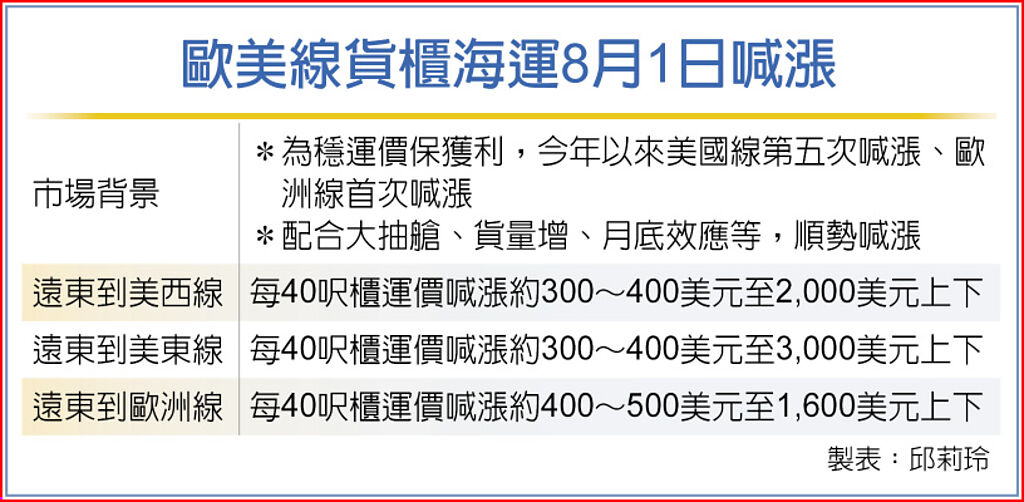 同時,歐洲線8月1日起運價也喊漲400~500美元,每40呎櫃漲至1,600美元上下,漲幅4~5成。歐、美線同步喊漲成功,將有助於長榮、陽明、萬海及貨代業第三季營運表現。