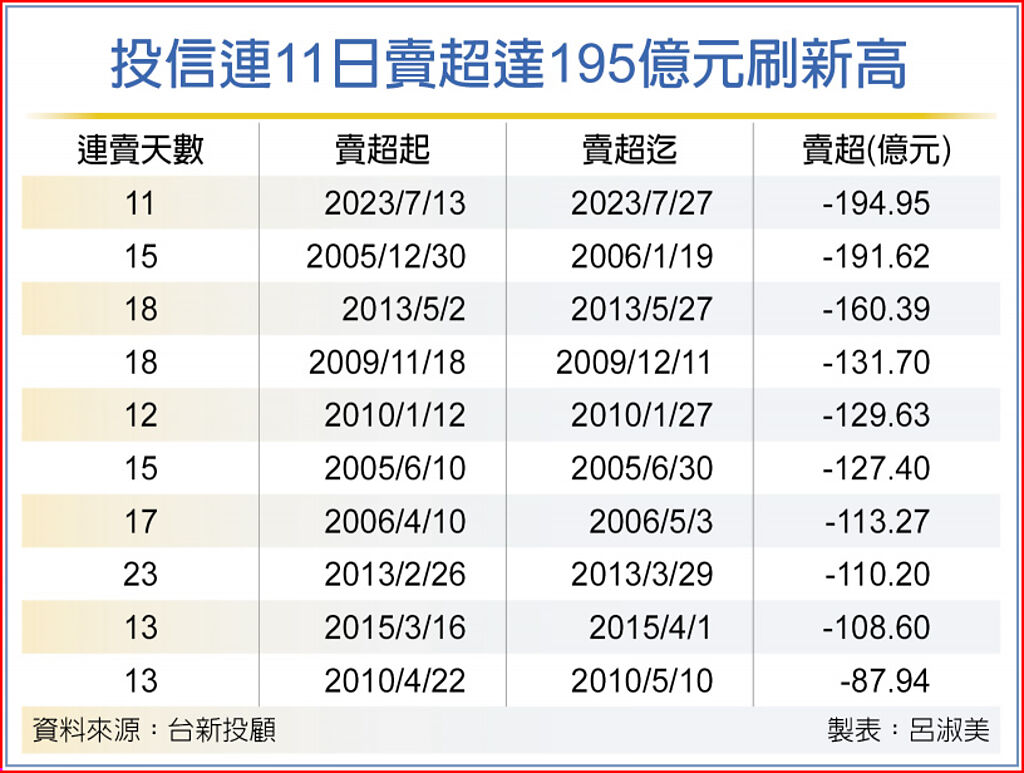 台新投顧統計,投信27日賣超15.5億元,累計連11日賣超達195.19億元,都寫下歷史罕見的紀錄,包括連11日賣超,是寫下2017年11月23日至12月7日連11日賣超平高(當時連續賣超金額僅86.36億元)。
