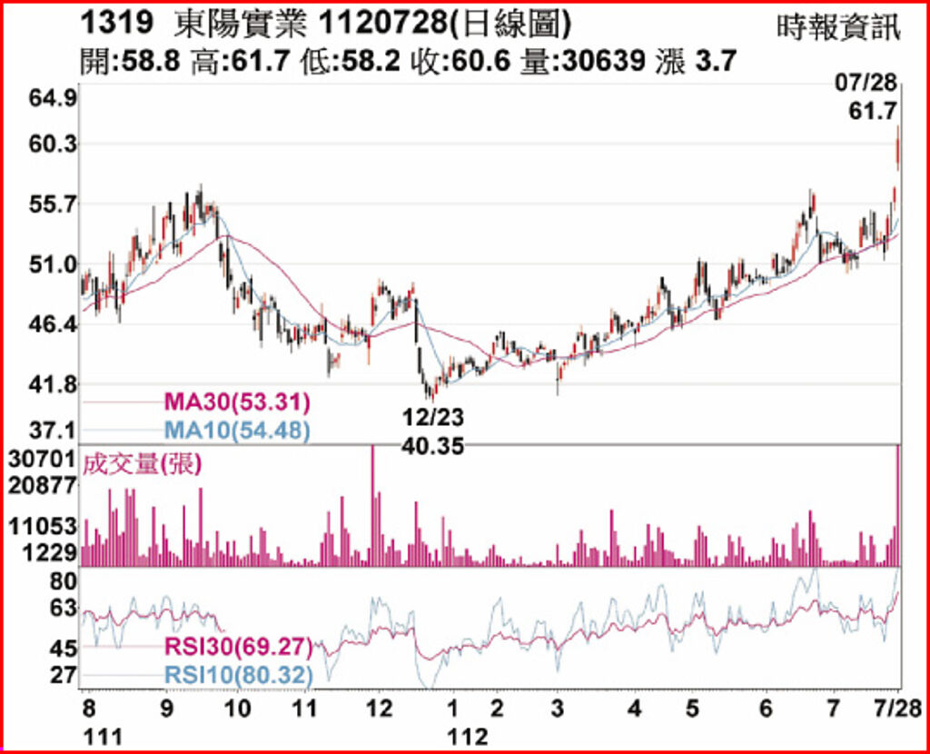 隨上半年業績創同期高,東陽(1319)28日股價開高走高續揚,最高觸及61.7元,終場收60.6元、上漲6.5%,創近6年高價,站穩短中長期均線,除均線上揚,周KD亦出現黃金交叉,三大法人聯手買超推升下,單日成交量放大至30,639張。