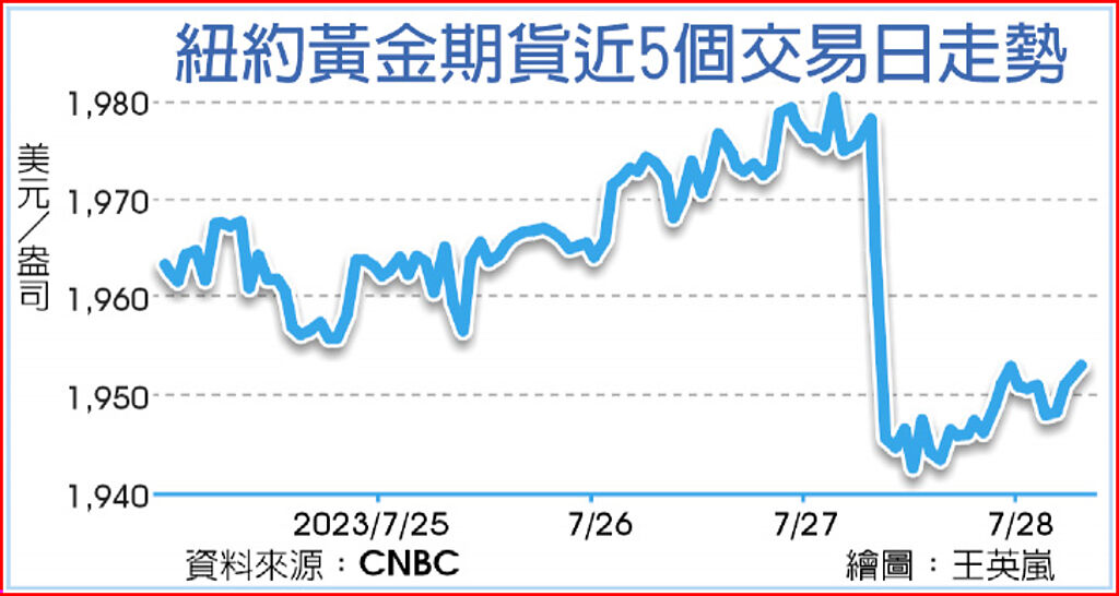 由於美國經濟數據開高,帶動美元與美債殖利率上揚,黃金價格應聲走跌,不但下探近半個月新低,周線還可能寫下5周來最大跌幅。28日黃金現貨價與紐約期貨價分報1,951與1,952美元,小漲約0.2%,但仍在7月12日以來低點。紐約期金27日重挫24.40美元或1.2%,本周累計跌幅約0.8%,將是6月23日以來最大周線跌幅。 |