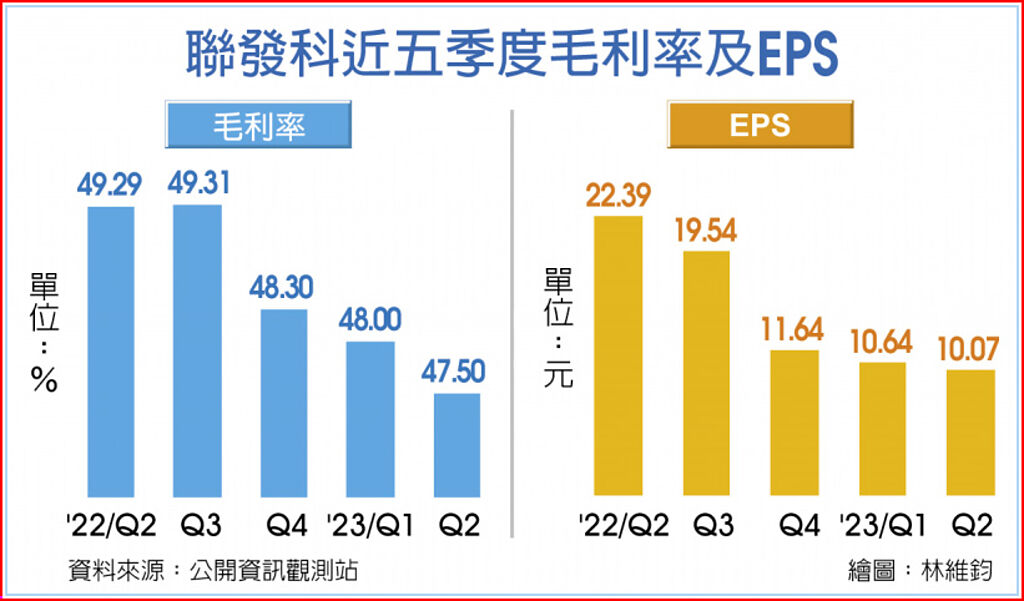 受到全球手機需求不振的影響,第二季稅後純益160.19億元,年減55%,毛利率47.5%,不但創下近六季低點,EPS為10.07元則創下十季來新低,累計上半年稅後純益329.09億元,EPS達20.71元