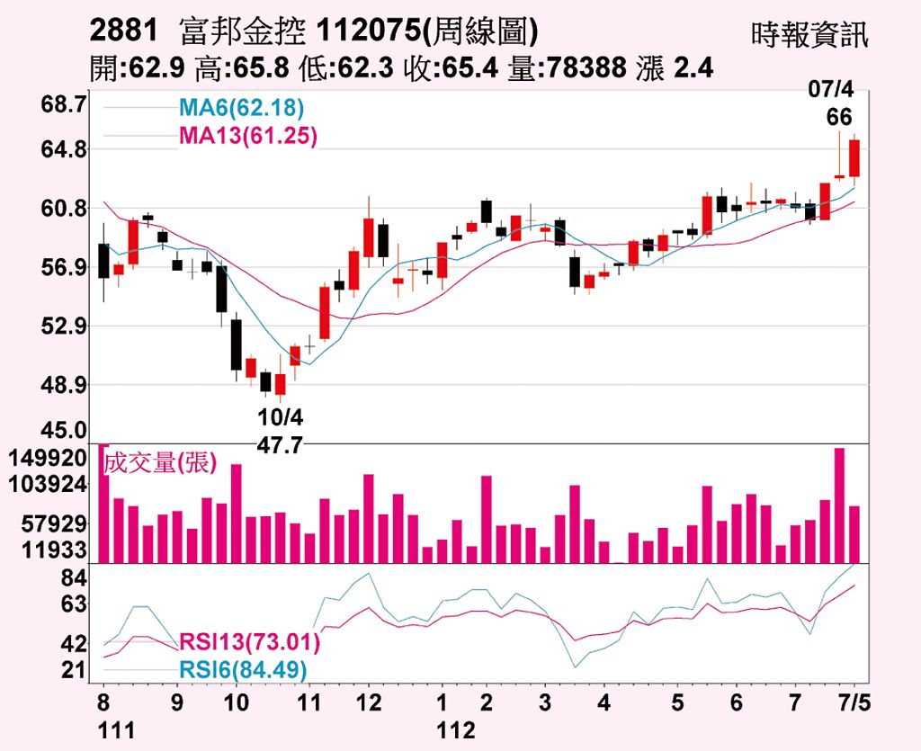 富邦金本周股價上揚,28日收盤為65.4元,本周上漲2.5元、3.97%。三大法人本周五個營業日合計買超9,565張,其中投信賣超1,169張,外資買超9,630張,自營商買超1,104張;目前股價在周線64.18元、月線62.71元之上。 |