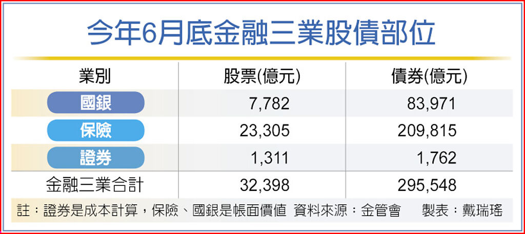 金管會統計,金融三業持股帳面價值升至3兆2,398億元,為去年6月以來新高。6月券商自營部位加碼203.6億元,國銀6月也加碼110億元,壽險6月轉為加碼38.5億元,金融三業對台股從5月減碼近53億元,6月轉為加碼超過352億元。