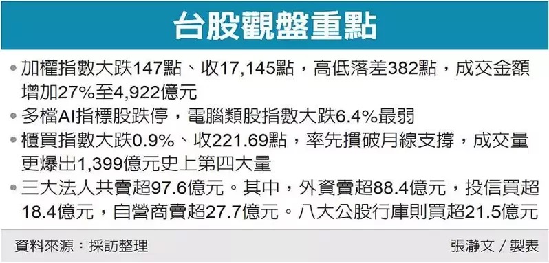 法人指出,大盤上沖下洗,震出三個短線回檔訊號。首先,上市櫃都出現「價跌量增」的不利結構,特別是櫃買指數昨日爆量大跌0.9%,收221.69點,成交量擴大至1,399億元,創史上第四大量;其次,領漲的AI族群紛紛重挫,短線主流股可能將異位;第三,大盤當沖比不斷攀高,最近大都在40%以上,昨日仍高達四成,顯示投資人愈來愈居高思危。