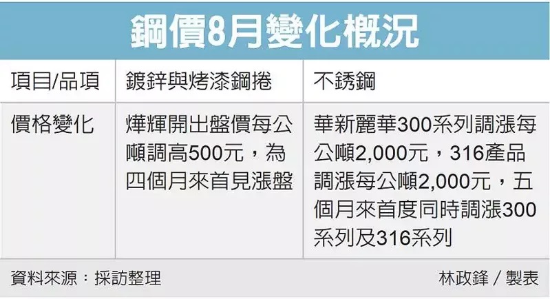 燁輝指出,各家主力大廠針對8月已陸續開出平高盤,迎接第3季國際鋼鐵價格有機會反彈前提下,為增進客戶建立庫存需求,燁輝告別連續三個月跌勢,四個月來首次開漲盤,主因全球總體經濟正向發展。