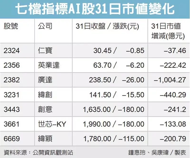 AI族群昨(31)日股價早盤普遍開高後不久陸續豬羊變色,兩大人氣股廣達、緯創罕見同步跌停收市,英業達也一度遭摜殺至跌停板後打開,終場大跌逾8.8%,仁寶也跌約2.7%;千金AI股創意、世芯-KY、緯穎都重挫,創意跌停,七檔指標AI股昨天市值合計銳減逾2,250億元,成為台股重災區。