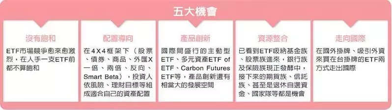 台灣ETF發展20年,市場競爭愈來愈激烈,投信法人認為,隨著競爭白熱化,ETF戰國時代來臨,但有五大機會仍遠大於挑戰:沒有飽和、配置導向、產品創新、資源整合、走向國際。
