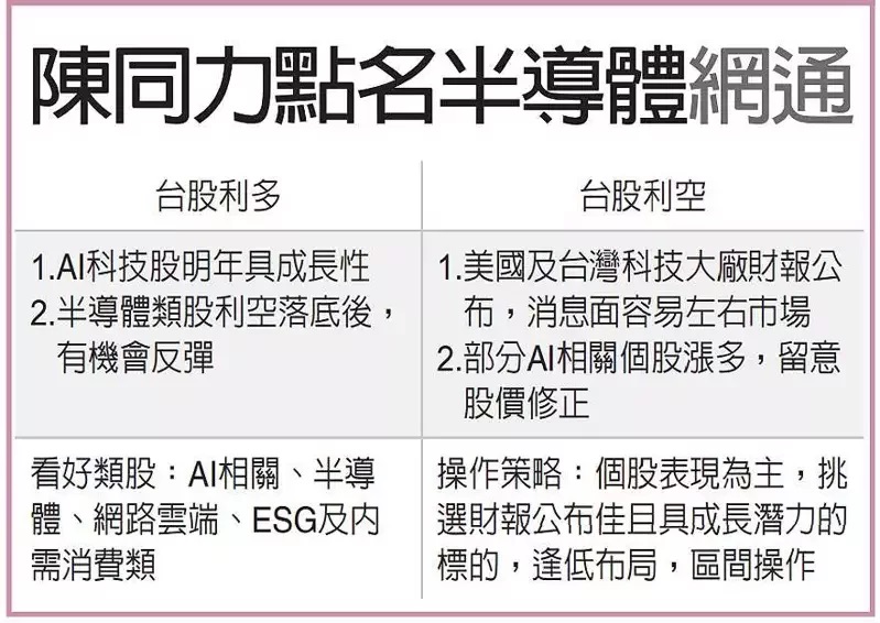 因AI相關類股普遍反映明年的成長性,評價高於一般電子股,但建議先不追高,避免短線炒作熱門股票;另外,半導體類股如台積電法說會公布後,市場也有一波股價先行反應,有機會落底反彈,因此建議布局股價便宜,且相對受惠AI相關題材的半導體類股。