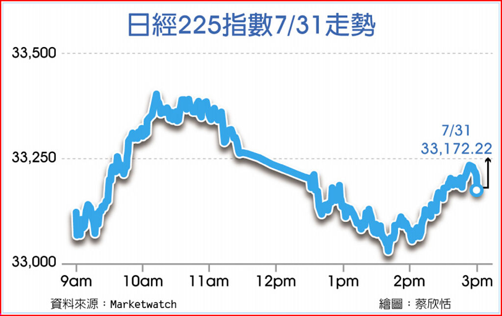 日經225指數7月31日盤中一度大漲2%,終場漲幅收窄至1.26%,以33,172.22點作收。東證一部指數勁升1.39%,報2,322.56點,寫下33年新高水準。