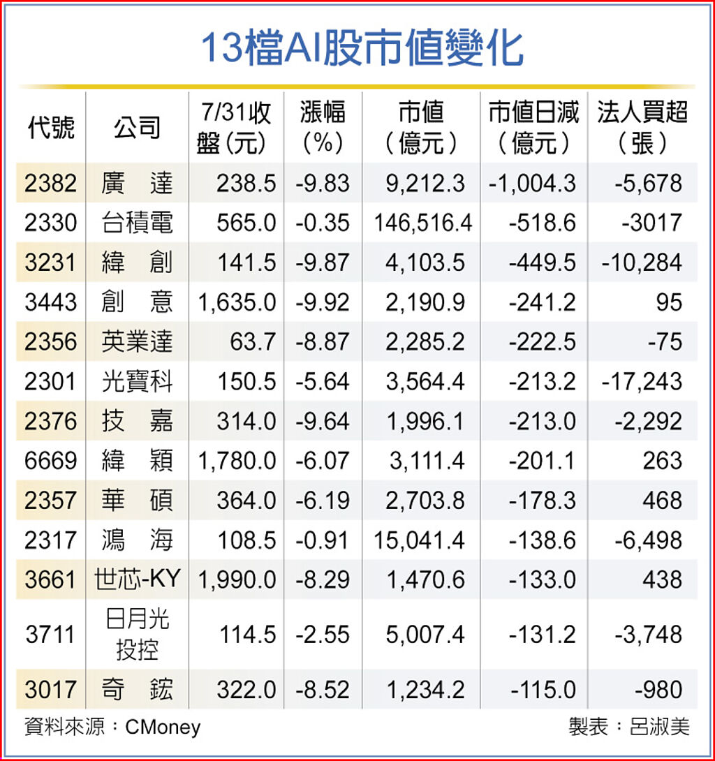 篩選7月31日市值跌逾100億元以上AI概念股,包括廣達、台積電、緯創、創意、英業達、光寶科、技嘉、緯穎、華碩、鴻海、世芯-KY、日月光投控、奇鋐等。