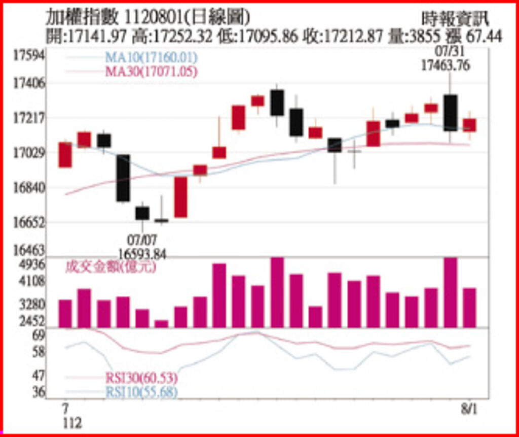 盤勢分析及選股:大盤在攻17,463點呈現過關拉回,創意兩根跌停扮演殺手?估計目前財報公布震盪必然加大,AI族群如伺服器、資服、機殼、散熱等需觀察其抗震力道。美國2023年度國防授權法案中,允許總統使用PDA撥款權,將美軍現有的武器、裝備交給台灣,每年最多10億美元,拜登7月28日首度動用總統撥款權PDA,提供台灣3.45億美元的軍事援助,軍工股是否發酵值得觀察。另中國7月碳市場價格呈現躍增態勢,日均收盤價為每公噸60.61元(月漲4.9%),台灣碳權交易所8月7日即將開幕,碳權概念股農林、華紙、叡揚、倍力等也值得觀察。 |
