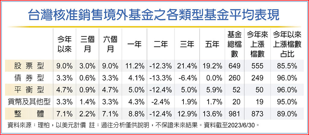 2023年上半年,全球股市展現驚人的活力,根據理柏統計,台灣核準銷售境外基金上半年整體平均上漲7%,在981檔境外基金中,有873檔,約當9成基金有正報酬表現(見表)。649檔境外股票型基金上半年亦繳出平均9%的成績單,其中更有55檔股票型基金漲幅逾兩成,當中32檔為科技股票型和美國股票型基金,股票市場展現出驚人動能。相對於股市的快速變化,債券市場維持了其相對穩健的表現,整體表現符合期待。