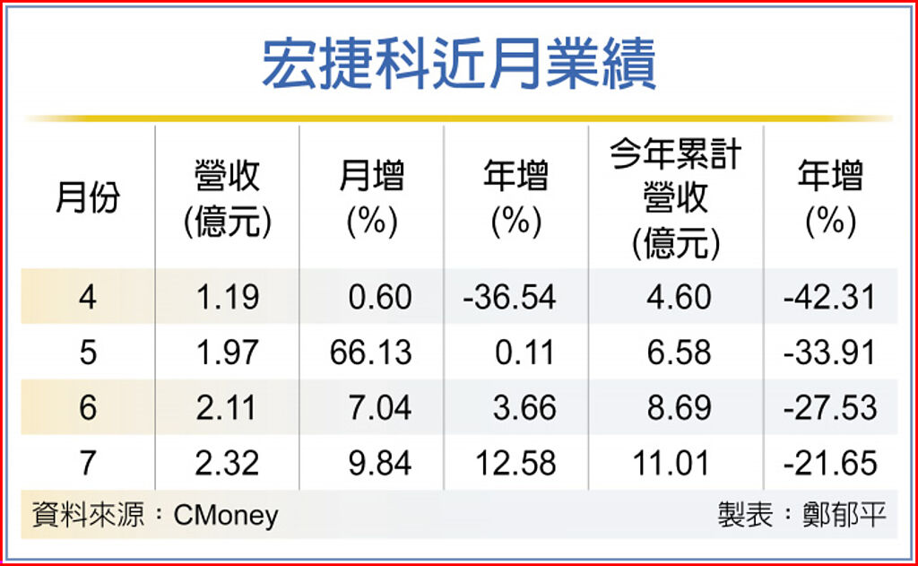 宏捷科業績復甦不停歇,7月營收2.32億元;累計前七月營收亦達11.01億元,順利突破10億元大關,年減幅度再收斂至21.65%。宏捷科表示,目前客戶庫存均已消化至非常健康的水準,客戶也拉貨動能也穩健持續,第三季展望依舊樂觀。