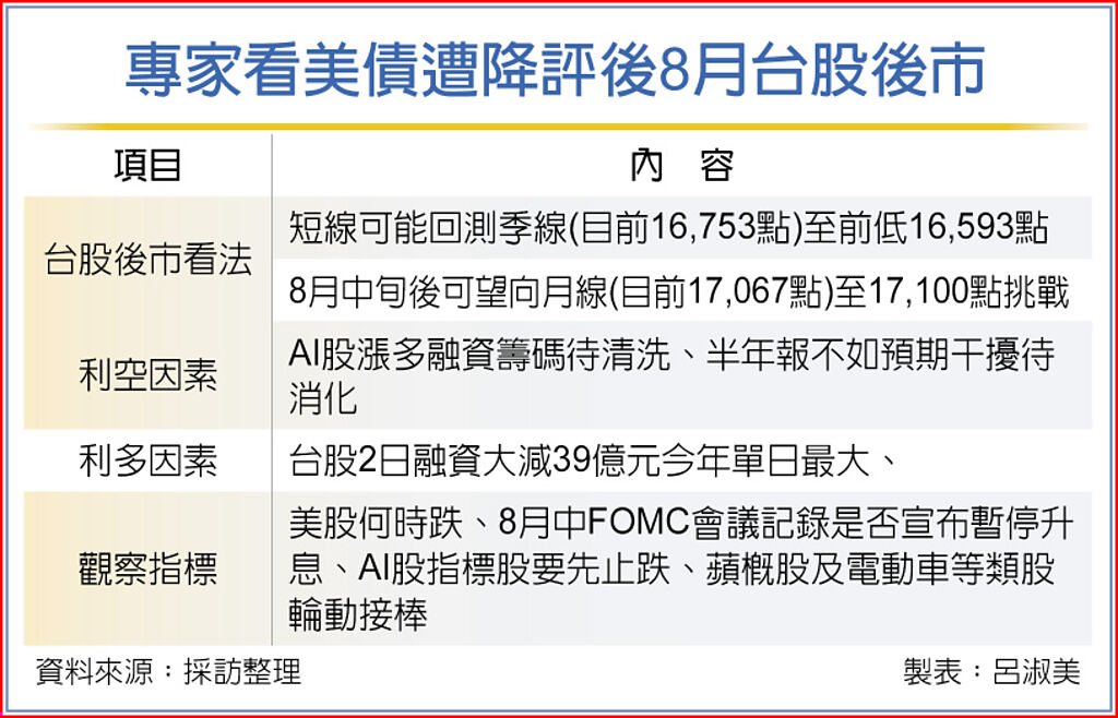 不過,台新投顧副總黃文清及資深證券分析師杜金龍對後市稍保守,接下來要看美股3日能否止跌,若美股持續下修,預期台股加權指數跌破季線的機率性不低,可能回測至前低16,593點前止穩。黃文清分析,台股AI股今年前7月漲幅已大,尤其7月漲勢淩厲,散戶融資餘額大增AI股、市場資金也過度集中在AI股,本來就有拉回壓力,美國主權債信遭降評只是導火線,讓AI股順勢拉回,美債信評降評並不是很大系統性風險,但短期衝擊市場信心。