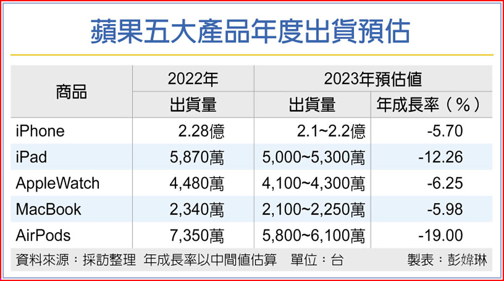 此外,蘋果五大消費性電子產品市況低迷,為歷年來首見,國內券商龍頭投顧預估,iPhone全系列產品全年銷量約2.1~2.2億台、年減5.7%,蘋果其他產品如iPad、MacBook、AppleWatch、AirPods,也面臨銷售衰退的命運,今年出貨量約5,000~5,300萬台、2,100~2,250萬台、4,100~4,300萬台及5,800~6,100萬台,年減6.25~19%。