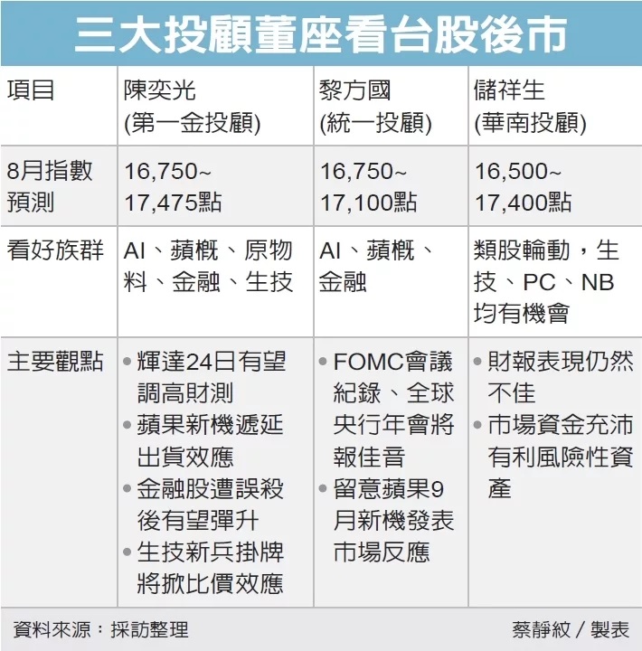 綜合三大董座對台股8月中下旬轉強看法,共有五大原因,首先是美聯準會估約16日公布FOMC會議紀要,有望出現多位與會者支持暫停升息談話,其次輝達(NVIDIA)預計24日公布財報,可能同步調升財測,三是24~26日將舉行全球央行年會,預料聯準會將標榜美國出現通膨下降、經濟未降溫的「金髮女孩經濟」佳績,第四是蘋果9月發表新機將提前帶動供應鏈業績,第五是全球資金浮濫勢必追求風險性資產。