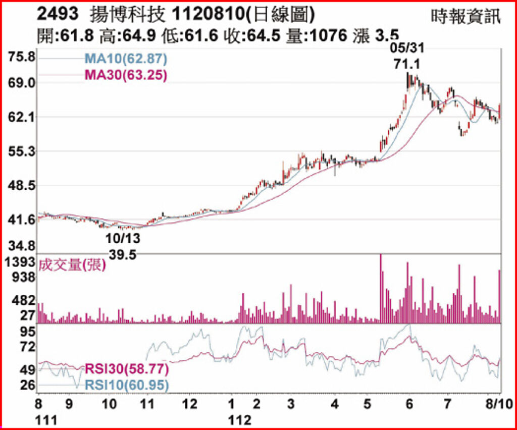 PCB設備廠揚博(2493)10日股價逆勢上揚,終場上漲5.74%、收在64.5元,一根紅K棒,向上突破月線。