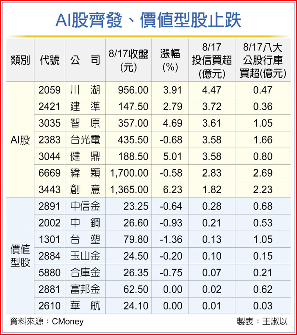 八大公股行庫及投信的國家隊雙資金17日兵分兩路進行護盤,除了持續拉抬產業展望樂觀的AI股,維繫台股主流股人氣外,更進場護盤台化(1326)、南亞(1303)、台塑(1301)、中鋼(2002)及金控等價值型的股票。