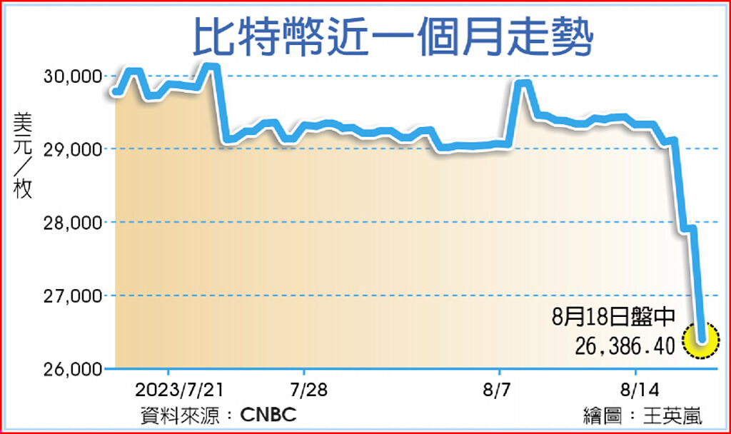 根據CoinMarketCap資料,比特幣17日狂崩8%,下探25,409美元,跌至二個多月低點。18日比特幣價格回升,在台灣時間下午5時報價約26,504美元,24小時跌幅5%。