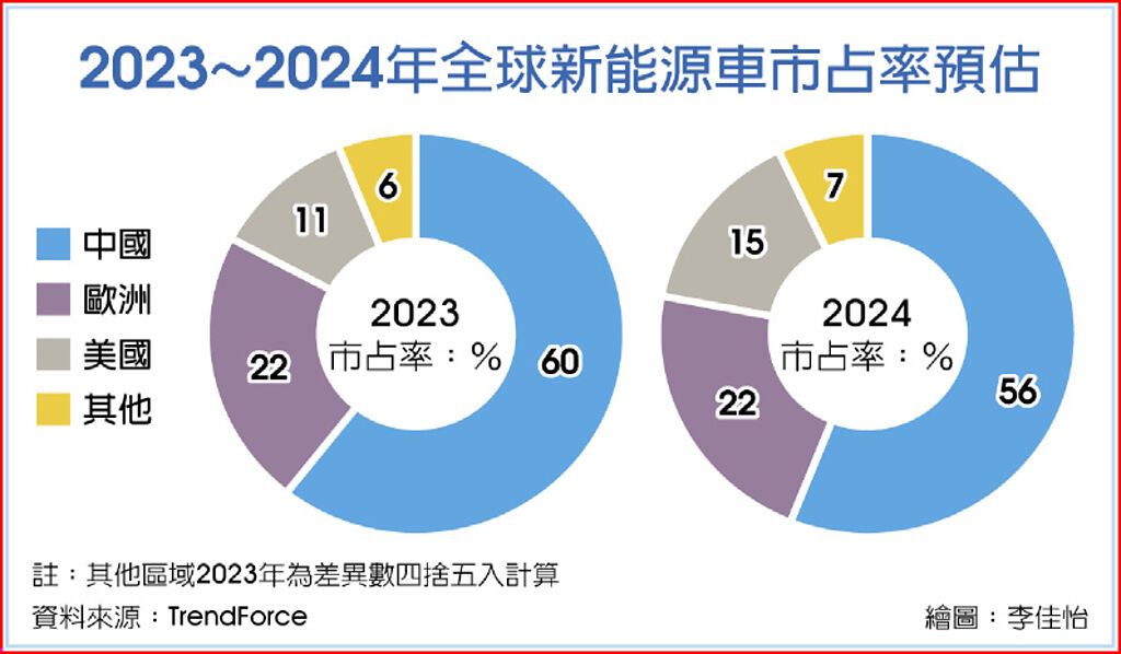 市況不佳,中國車市持續價格競爭,新能源車需求一路領先的中國市場也蒙塵,TrendForce推估,中國在全球市場的銷售占比恐由2023年的60%微幅下修至56%,惟近年努力攻占中國車市的元山和泰碩均表示,對中國車市保守看待,不過目前對訂單影響不大。