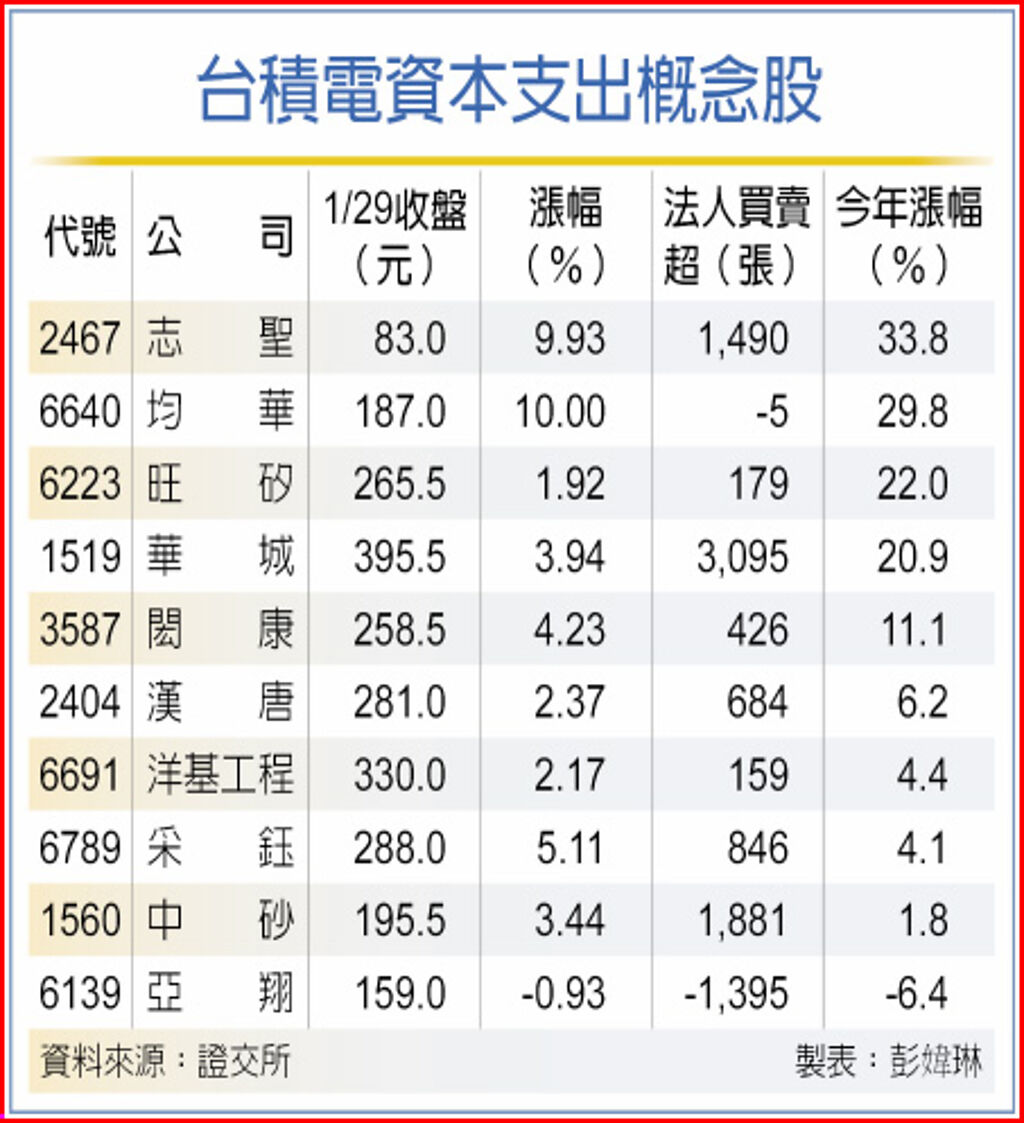 在台積電法說中釋出今年資本支出約280億美元到300億美元,且傳出日本熊本二廠將投入興建、美國建廠補助10億美元將到手後,志聖(2467)、均華(6640)、采鈺(6789)等相關設備廠29日股價上揚,可持續留意後續行情。