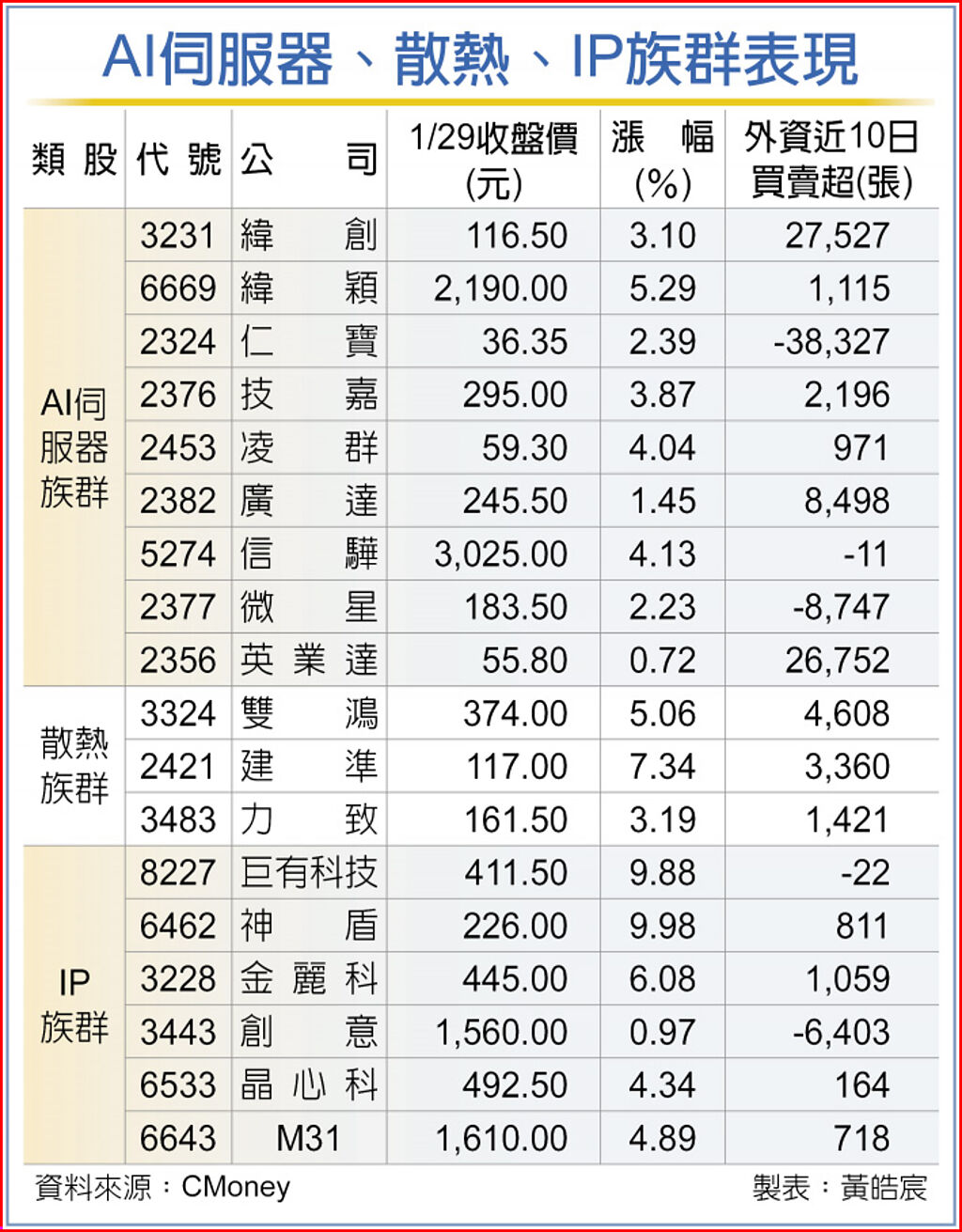 其中AI伺服器指標千金股緯穎,近期因中東供應鏈重啟,第一季表現可期,激勵股價開高走高往上衝漲5.29%,站上所有均線,股后信驊、淩群漲幅均超過4%,緯創、技嘉、仁寶、微星股價也上揚2~3%;另隨著國內外陸續推AI PC筆電、手機,發展都離不開散熱產品,散熱廠包括建準開高走高攻漲7.34%,雙鴻、力致也強漲5.06%及3.19%。